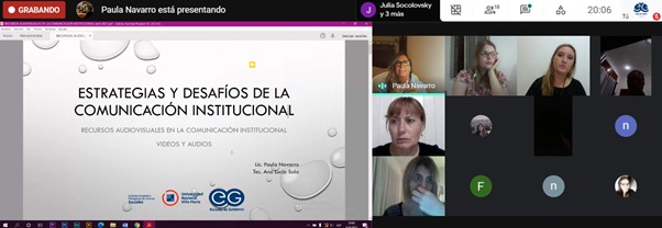 El día martes 6 de abril a las 20 horas, se llevó a cabo el cuarto encuentro del CURSO INTENSIVO DE FORMACIÓN ESTRATEGIAS Y DESAFÍOS DE LA COMUNICACIÓN INSTITUCIONAL Recursos audiovisuales en la comunicación institucional: videos y audios; a cargo de la Lic. paula Navarro y la Tec. Ana Lucía Sola ambas forman parte del Espacio Audiovisual de Sociales.