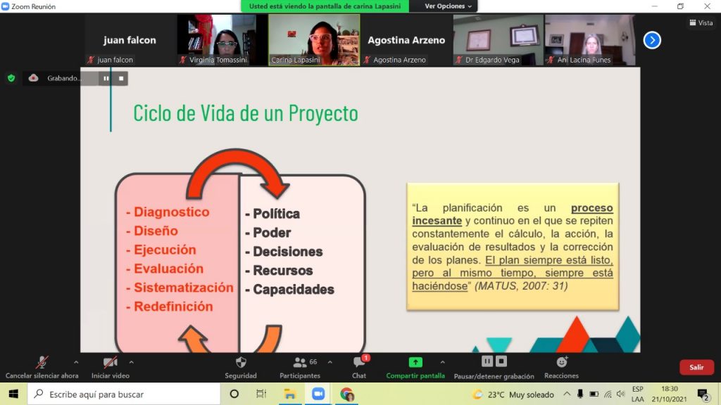 En el módulo se trabajó sobre herramientas prácticas para la elaboración y evaluación de proyectos de intervención y sus competencias para el desarrollo. La Abog. Bertone expuso su experiencia en áreas de gestión; experiencias posibles para llevar adelante distintos proyectos a partir de su vasta trayectoria como funcionaria.