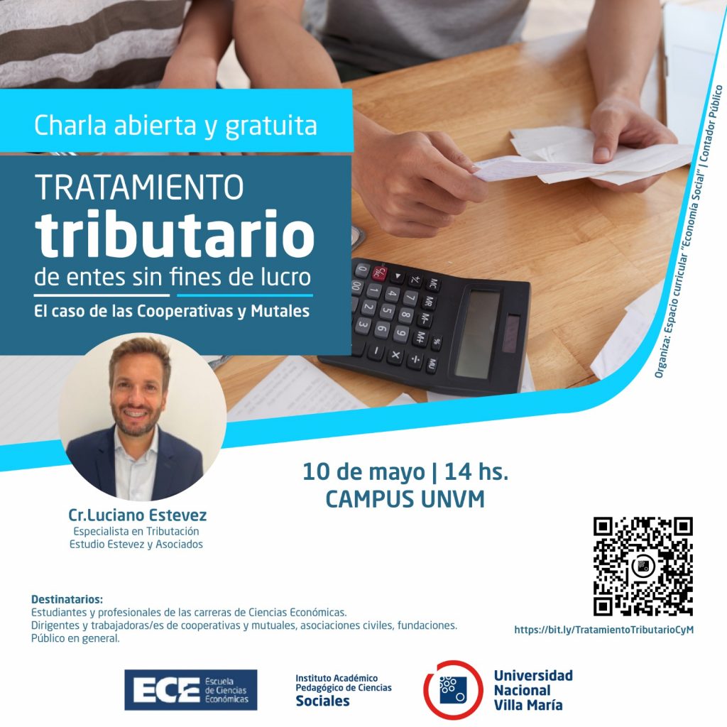Organizada por el Instituto de Ciencias Sociales de la UNVM, se realizará el próximo viernes 10 de mayo a las 14 horas en el Campus, la charla “Tratamiento tributario de entes sin fines de lucro”. Se trata de una charla abierta y gratuita, dictada por el especialista Luciano Miguel Estevez. El foco estará en estudiar el caso de organizaciones cooperativas y mutuales.
