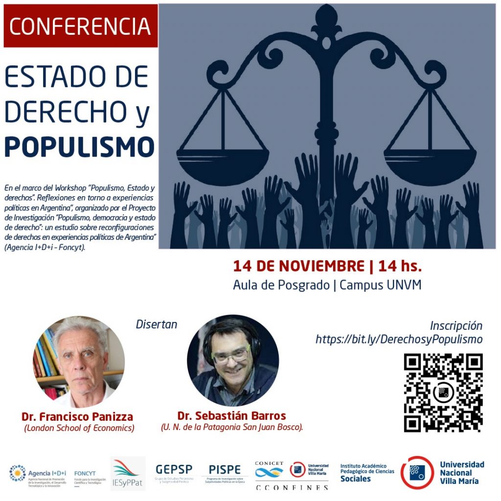 El próximo 14 de noviembre a las 14 hs; en el Aula de Posgrado del Campus Universitario, se realizará la conferencia abierta Estado de Derecho y Populismo, con la presencia del Dr. Francisco Panizza (London School of Economics) y el Dr. Sebastián Barros (Universidad de la Patagonia San Juan Bosco).