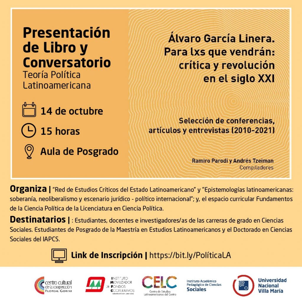 El Instituto Académico Pedagógico de Ciencias Sociales (IAPCS) a través de su Centro de Estudios Latinoamericanos del Centro (CELC) y el Espacio curricular Fundamentos de la Ciencia Política de la Lic. en Ciencia Política, llevará a cabo el próximo 14 de octubre a las 15 horas en el aula de Posgrado del Campus de la UNVM, la presentación del libro y un conversatorio sobre Teoría Política Latinoamericana. Estará coordinado por las docentes Silvina Irusta y Daniela Kunz.