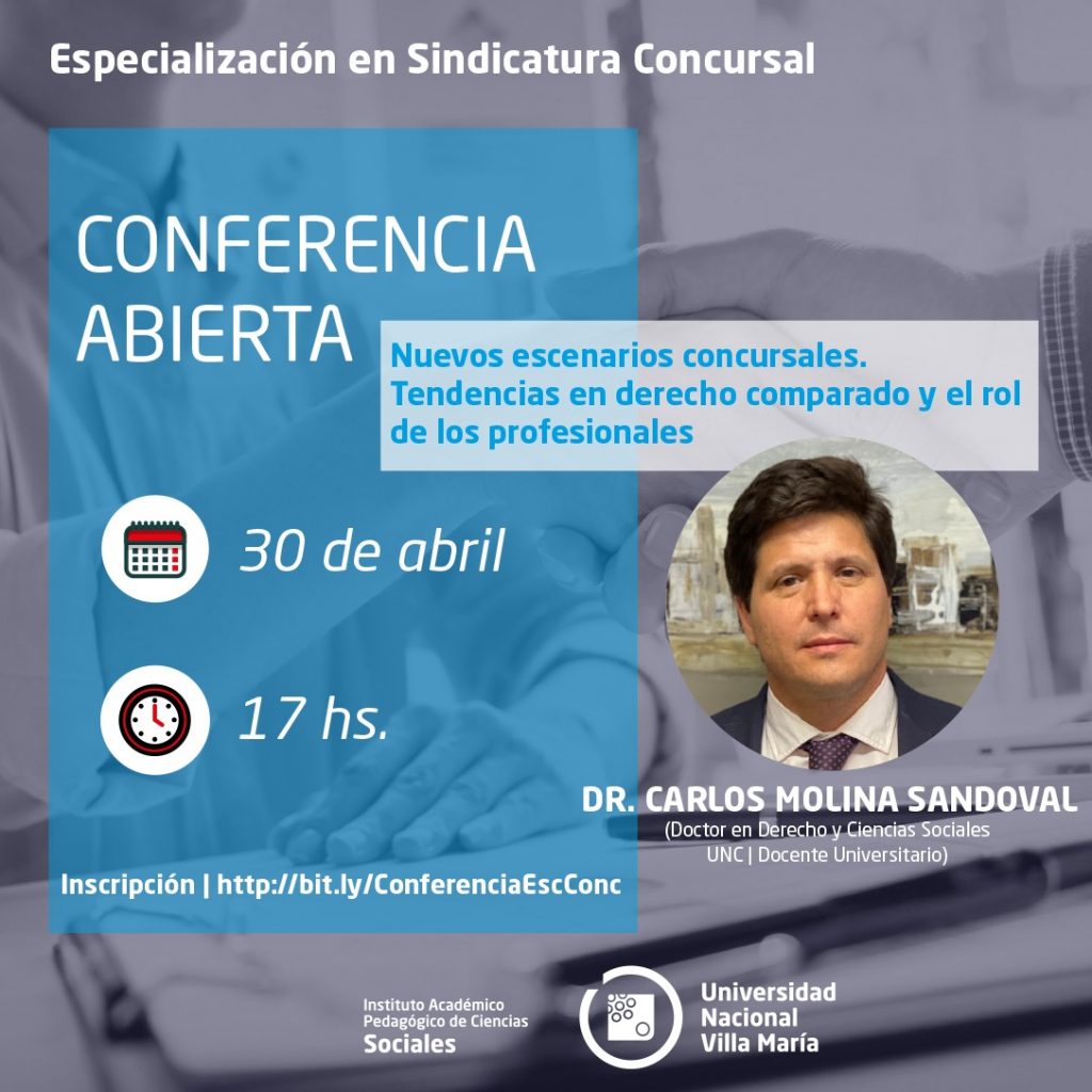 La disertación estará a cargo del Dr. Carlos Molina Sandoval, doctor en derecho y ciencias sociales, docente universitario de numerosas universidades nacionales públicas y privadas y director de la especailización en Sindicatura Concursal impulsada desde el Instituto de Ciencias Sociales de la Universidad de Villa María.