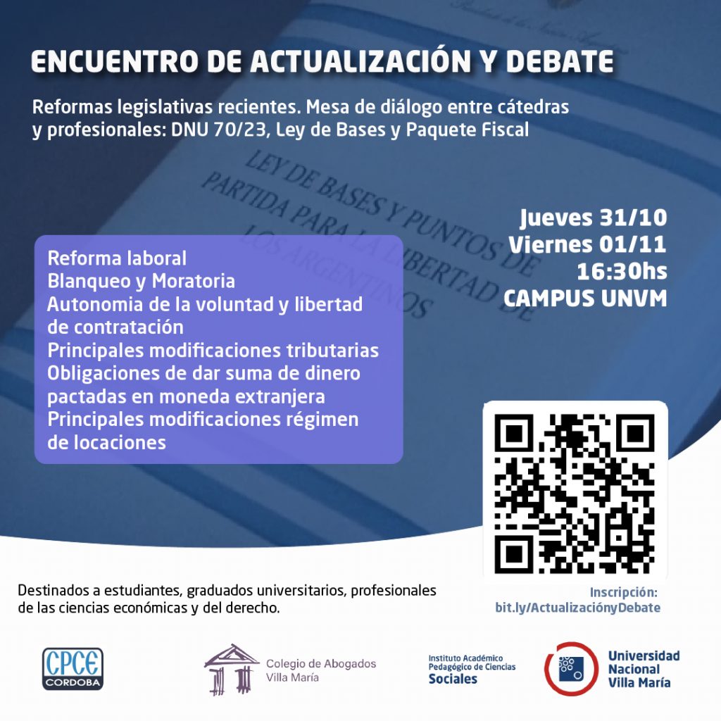 El encuentro, titulado “Reformas legislativas recientes. Mesa de diálogo entre cátedras y profesionales: DNU 70/23, Ley de Bases y Paquete Fiscal” se llevará a cabo en el Campus de la sede Villa María, el jueves 31 de octubre y viernes 1 de noviembre, a partir de las 16:30 de ambas jornadas.