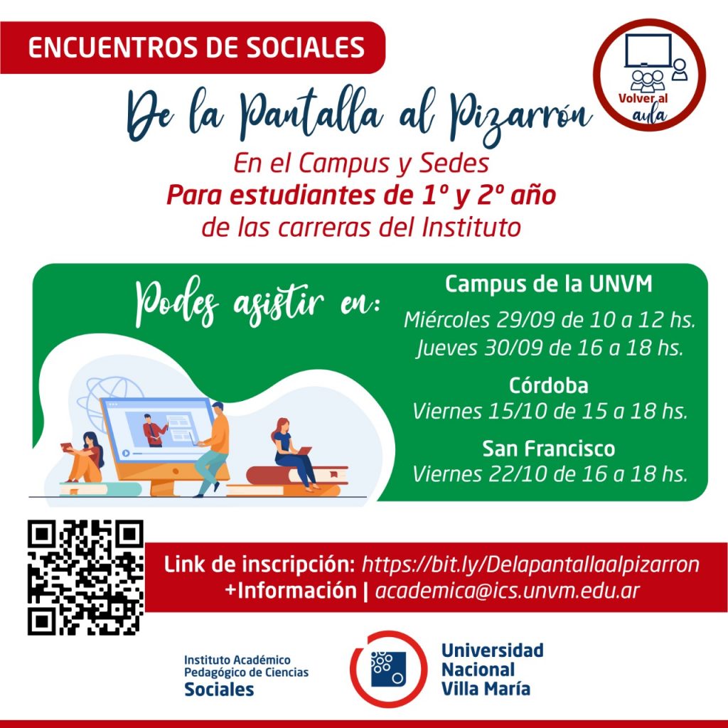 Bajo el lema De la pantalla al pizarrón: encuentros presenciales con ingresantes y estudiantes de primer y segundo año de la UNVM se desarrollarán instancias presenciales en el Campus y las sedes Córdoba y San Francisco. A partir de octubre se realizarán además talleres de lectura académica.
