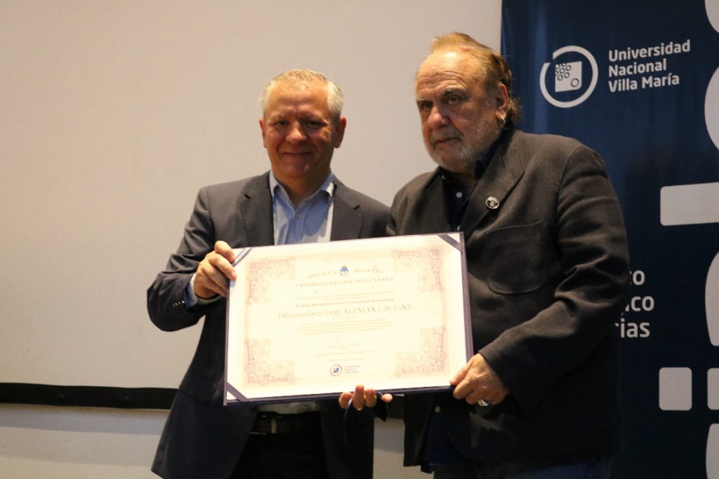 El Instituto Académico de Ciencias Sociales (IAPCS) llevó a cabo la designación de Jorge Alemán, psicoanalista y escritor, como Profesor Honorario de la Universidad Nacional de Villa María (UNVM). Durante la ceremonia, el investigador y docente Jorge Foa Torres fue el encargado de compartir la Laudatio a Alemán haciendo un repaso por su trayectoria académica.