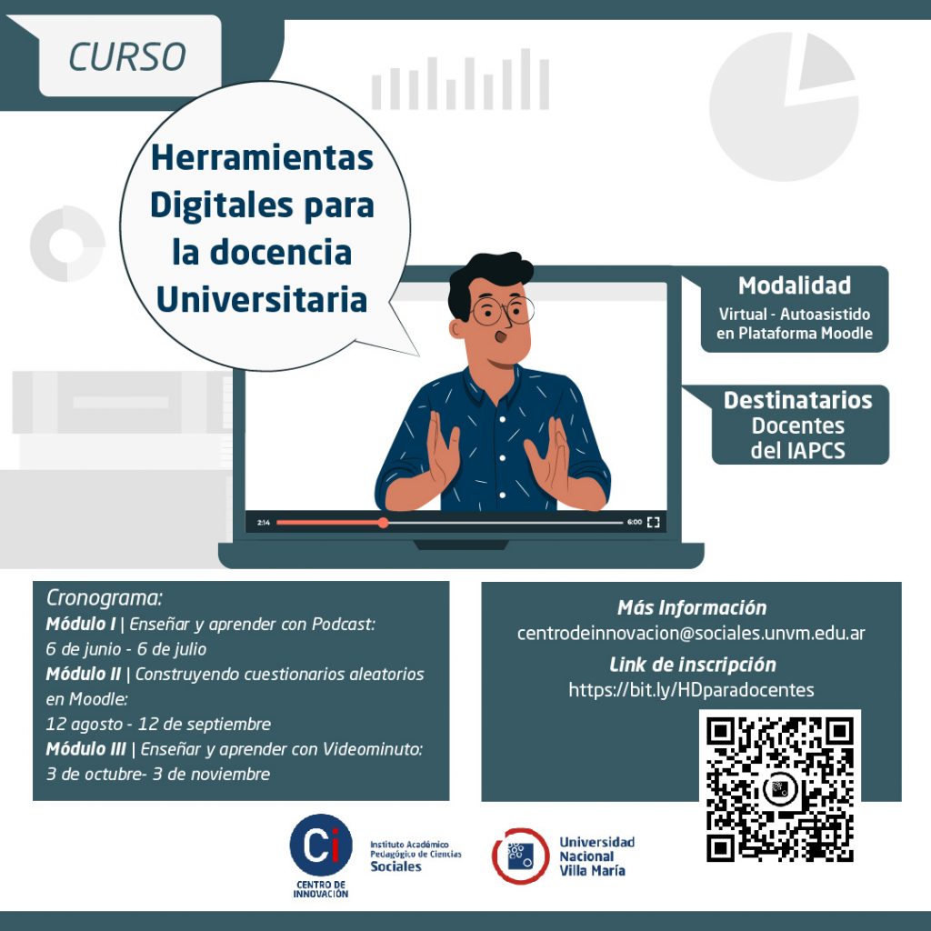 Durante 3 módulos que se dictarán de junio a noviembre del corriente año, se brindará conocimientos teóricos y técnicos en torno a la producción y uso de podcast, videominuto y cuestionario, además de promover el uso de herramientas digitales como propuestas pedagógicas.