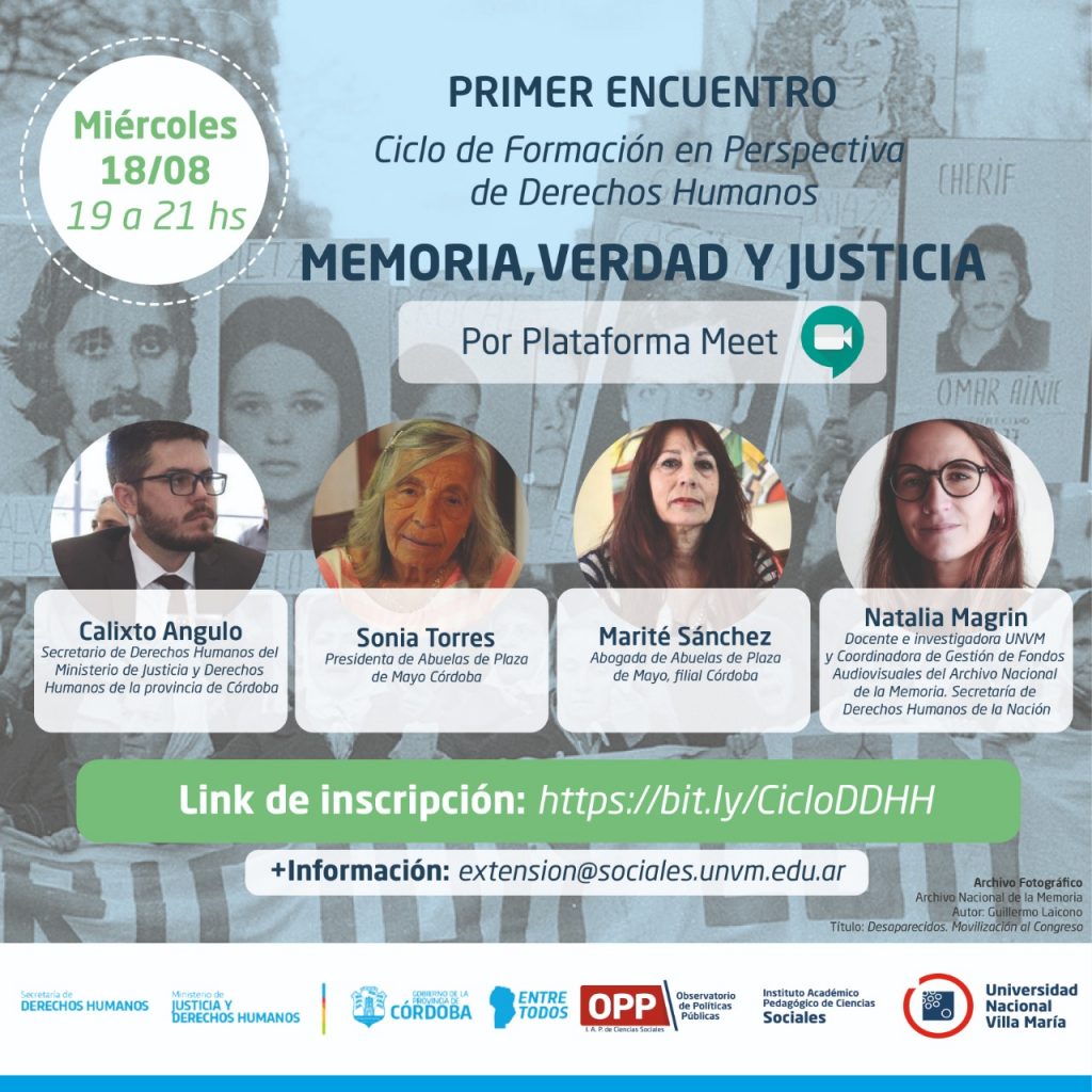 El primer encuentro, se llevará a cabo el día miércoles 18 de agosto, a las 18 horas, de manera virtual y abordará la temática “Memoria, Verdad y Justicia”, y expondrán: Calixto Angulo (Secretario de Derechos Humanos del Ministerio de Justicia y Derechos Humanos de la provincia de Córdoba); Sonia Torres (Presidenta de Abuelas de Plaza de Mayo Córdoba); Marité Sánchez (Abogada de Abuelas de Plaza de Mayo, filial Córdoba) y Natalia Magrin (Docente e investigadora de la UNVM; Coordinadora de Gestión de Fondos Audiovisuales del Archivo Nacional de la Memoria. Secretaría de Derechos Humanos de la Nación).