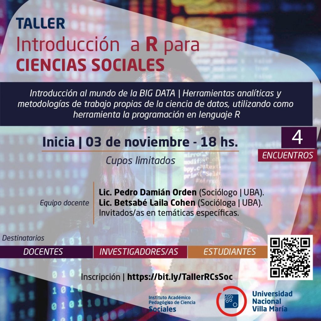 El día miércoles 03 de noviembre, a las 18 horas, de manera virtual, se realizará el Taller: Introducción a R para Ciencias Sociales.