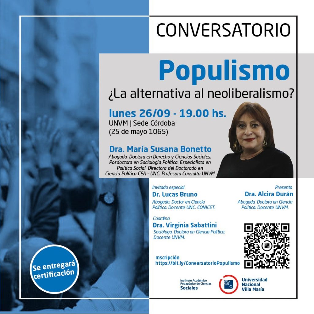 El próximo jueves 28 de septiembre a las 19 hs. se llevará a cabo el conversatorio “Populismo, ¿la alternativa al neoliberalismo?”. La propuesta será dirigida por la doctora María Susana Bonetto y tendrá lugar en la sede Córdoba de la UNVM (25 de mayo 1065, Córdoba).