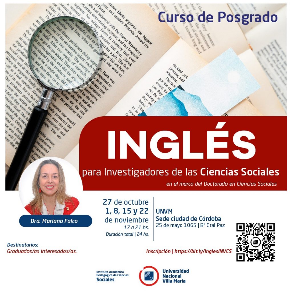 El próximo 27 de octubre inicia el curso de posgrado “Inglés para Investigadores de las Ciencias Sociales en el marco del Doctorado que se dicta en la sede del barrio Gral. Paz; y a cargo de las docentes Mariana Falco y Noelia Tortone.