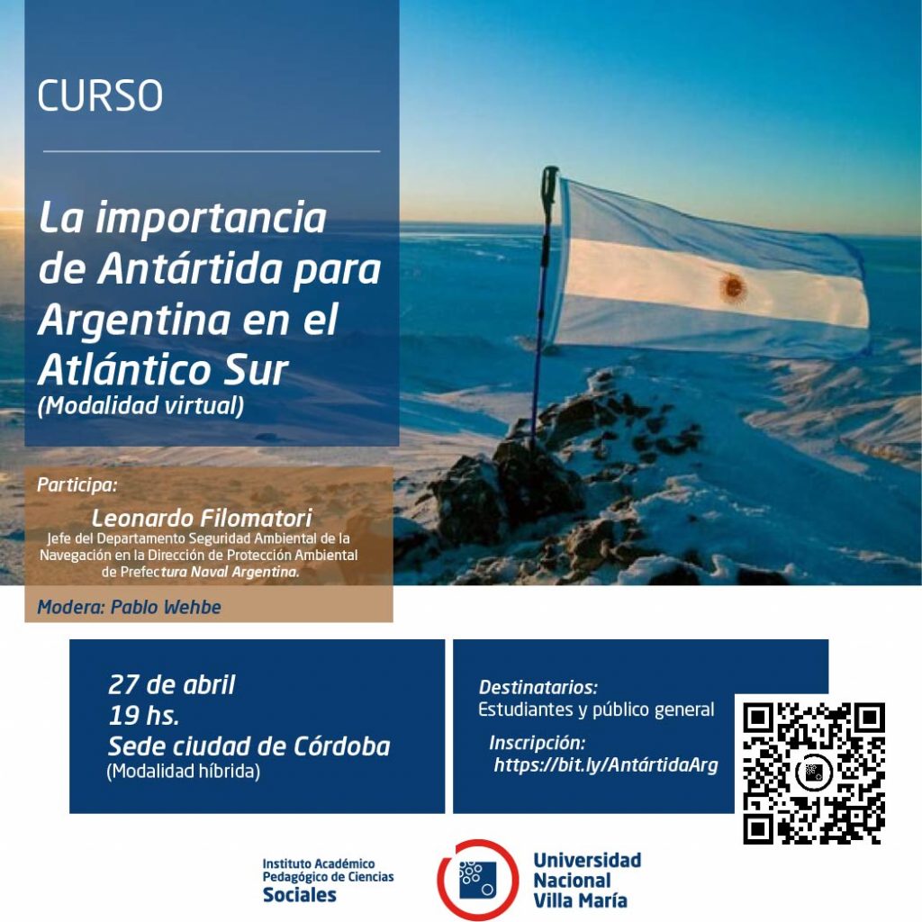 El día jueves 27 de Abril a las 19 horas, se realizará el curso La importancia de Antártida para Argentina en el Atlántico Sur. El encuentro, impulsado por el Instituto Académico Pedagógico de Ciencias Sociales (IAPCS) de la Universidad Nacional de Villa María (UNVM), contará con modalidad virtual y presencial en la Sede Ciudad de Córdoba (25 de mayo 1065 – Bº General Paz).