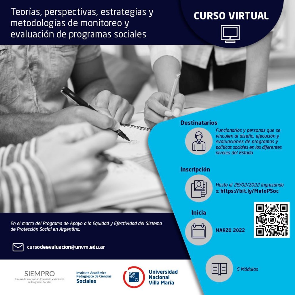 En el marco del Programa de Apoyo a la Equidad y Efectividad del Sistema de Protección Social en Argentina, el 18 de marzo dará inicio el curso de posgrado sobre Teorías, Perspectivas, Estrategias y Metodologías de Monitoreo y Evaluación de Programas Sociales, que se llevará a cabo por el Instituto de Ciencias Sociales de la UNVM en coordinación con el Sistema de Información, Evaluación y Monitoreo de Programas Sociales (SIEMPRO), en el marco del contrato entre el Consejo Nacional de Políticas Sociales y la UNVM.