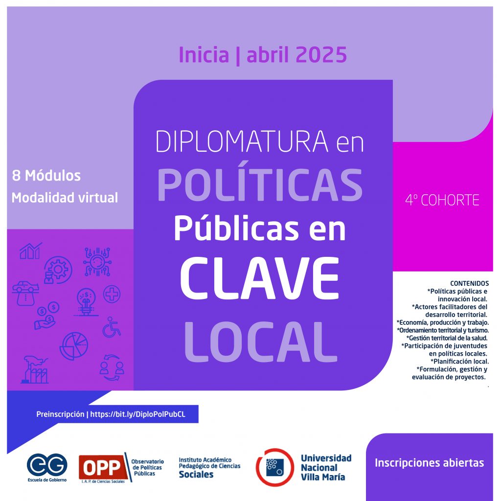 A partir del mes de abril del año 2025 se comenzará a dictar bajo modalidad virtual, la 5º cohorte de la propuesta de formación impulsada desde el Observatorio de Políticas Públicas y la Escuela de Gobierno del Instituto Académico Pedagógico de Ciencias Sociales de la Universidad Nacional de Villa María.