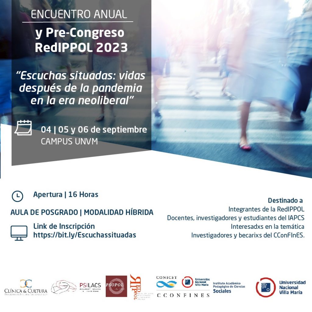 Los días Lunes 4, Martes 5 y Miércoles 6 de Septiembre, se llevará a cabo el Encuentro anual y Pre-Congreso RedIPPOL 2023 bajo el lema “Escuchas situadas: vidas después de la pandemia en la era neoliberal”. La actividad se realizará de manera híbrida, presencial en el campus de la UNVM, en el aula de posgrado “Malvinas Argentinas”. A su vez, para los expositores que no puedan asistir en forma presencial, estará disponible vía meet.