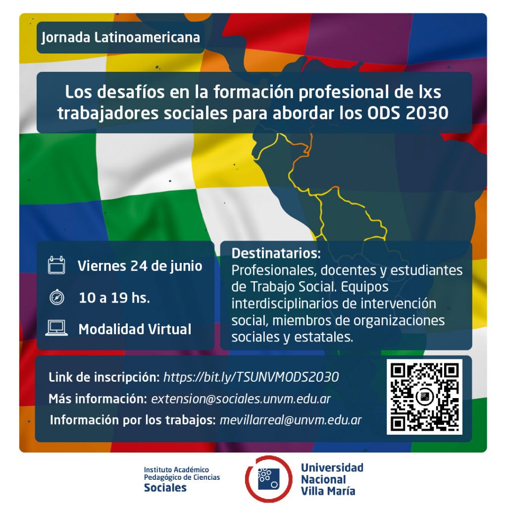 El Instituto de Ciencias Sociales de la UNVM, a través de la Lic. en Trabajo Social que se dicta en la casa de altos estudios, llevará a cabo el próximo 24 de junio de 9 hs. a 19 hs. en el Campus Universitario, la jornada Latinoamericana “Los desafíos en la formación profesional de los/as trabajadores/as sociales para abordar los ODS 2030”, destinado a profesionales, docentes y estudiantes de Trabajo Social, equipos interdisciplinarios de intervención social, miembros de organizaciones sociales y estatales.