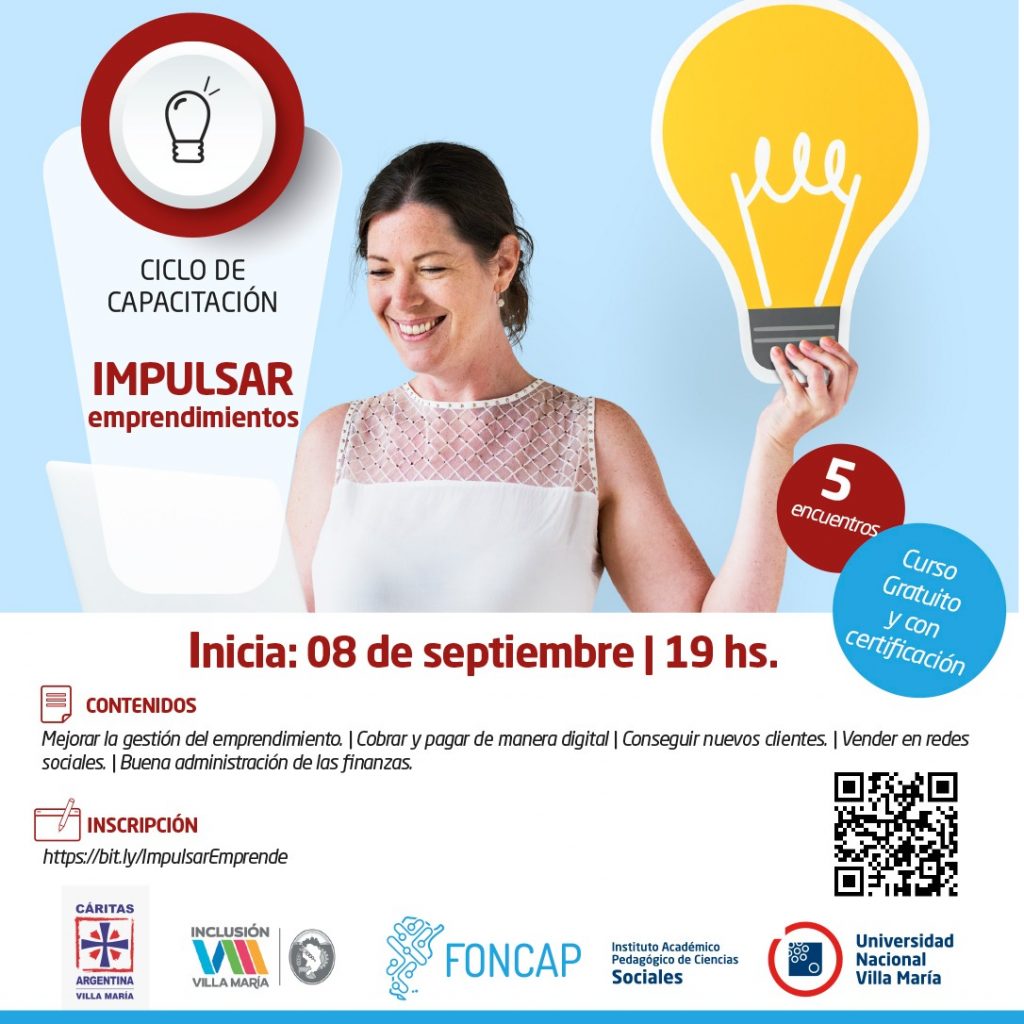A partir del 08 de septiembre a las 19 horas, de manera virtual, se dictará desde el Instituto de Ciencias Sociales de la UNVM, junto a la Secretaria de Inclusión Social de la Municipalidad de Villa María, Cáritas seccional Villa María y el Fondo de Capital Social (FONCAP), el Ciclo de Capacitaciones: Impulsar Emprendimientos VM 2021.