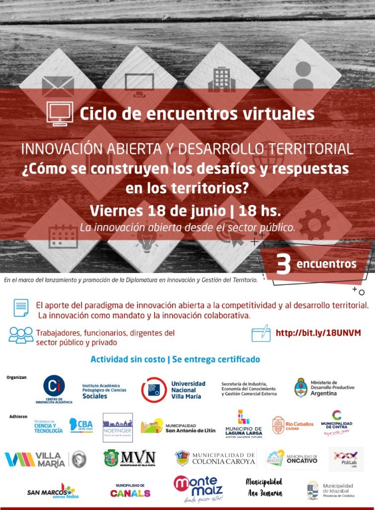 El día viernes 18 de junio, a las 18 hs; inicia el “Ciclo Virtual de Innovación abierta y desarrollo territorial”; en el marco del lanzamiento y promoción del Diplomado en Innovación y gestión del Territorio impulsado desde el Instituto de Ciencias Sociales de la UNVM.