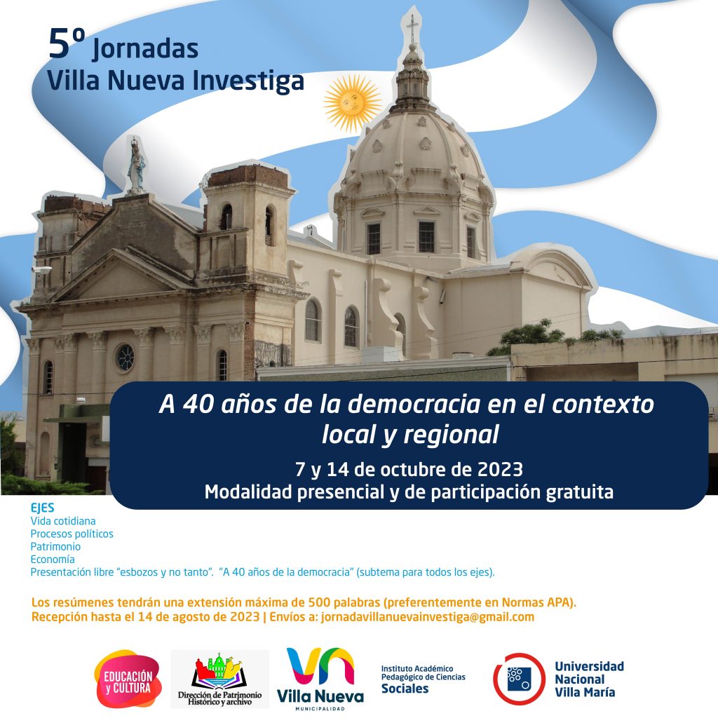 El Instituto Académico Pedagógico de Ciencias Sociales (IAPCS) de la Universidad Nacional de Villa María (UNVM) junto a la Secretaría de Educación y Cultura, y la Dirección de Patrimonio Histórico y Archivo pertenecientes a la municipalidad de Villa Nueva, invitan a participar de las Quintas Jornadas Villa Nueva Investiga a 40 años de Democracia en el Contexto Local Regional, que se realizarán en modalidad presencial los días 7 y 14 de octubre de 2023, en el Punto Digital de la Casa de la Cultura en la ciudad de Villa Nueva, ubicada en Deán Funes 1259.