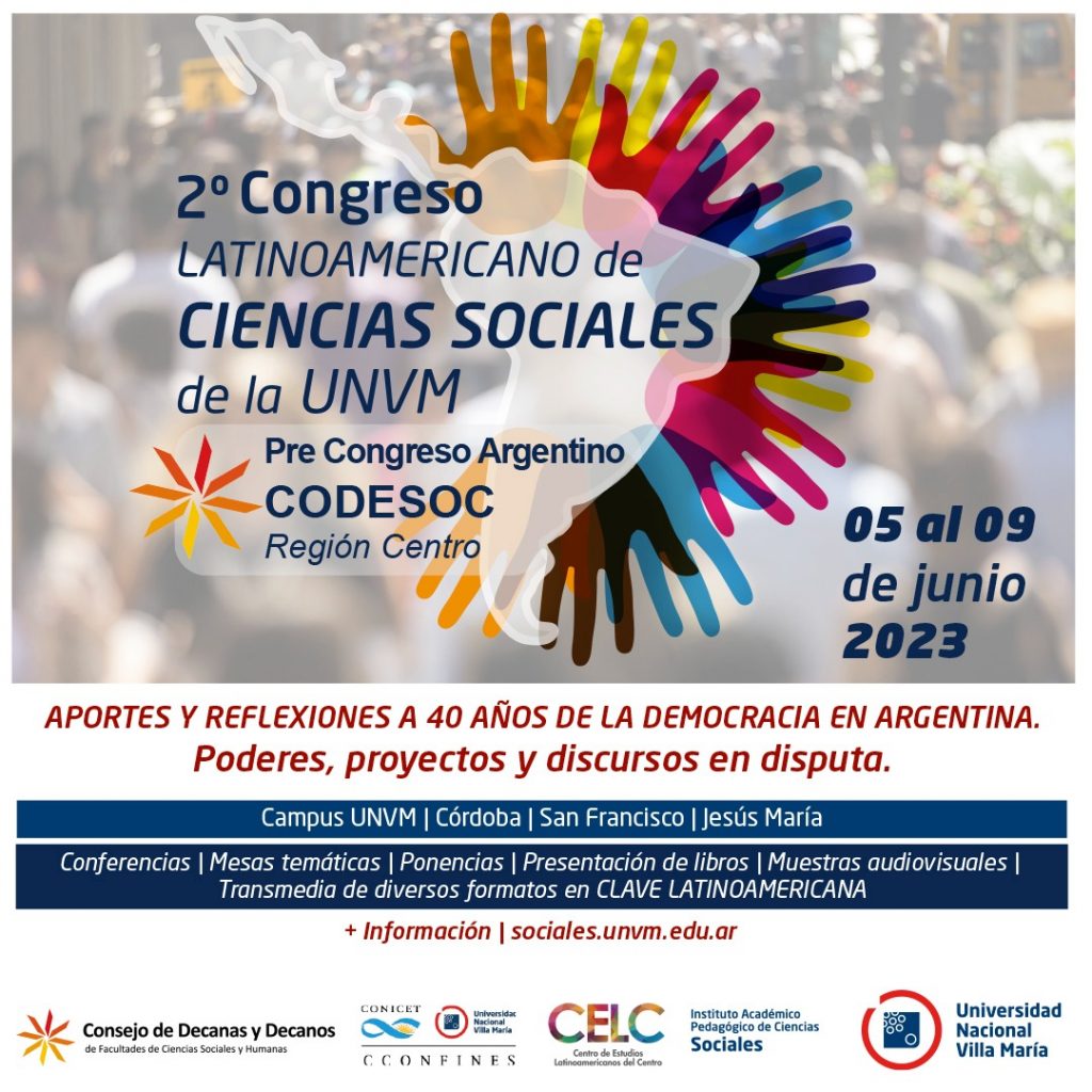 Del 5 al 9 de junio de 2023 se desarrollará el 2º Congreso Latinoamericano de Ciencias Sociales de la Universidad Nacional de Villa María (UNVM) y el Pre Congreso Argentino del Consejo de Decanos y Decanas de Ciencias Sociales (CODESOC – region centro), bajo el lema “Aportes y reflexiones a 40 años de la Democracia en Argentina. Poderes, proyectos y discursos en disputa ”, organizado desde por el Instituto de Ciencias Sociales de la Universidad Nacional de Villa María, con la participación de destacados especialistas del ámbito académico nacional y latinomericano.