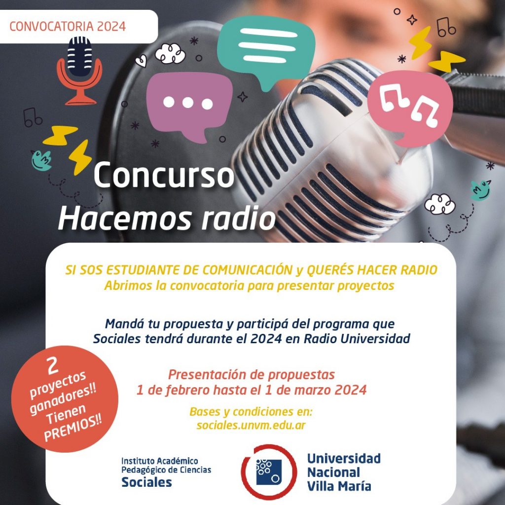 El Instituto de Ciencias Sociales de la Universidad Nacional de Villa María (UNVM) convoca a estudiantes de la carrera de Comunicación Social a la presentación de proyectos para la producción de segmentos en el programa radiofónico del IAPCS que se transmitirá a partir del 2024 por Radio Universidad.