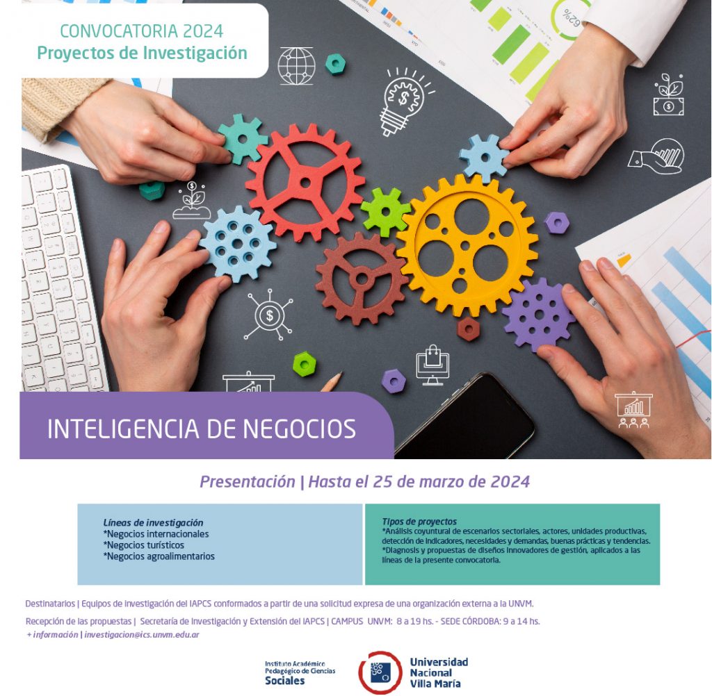 La Secretaría de Investigación y Extensión del Instituto A.P. de Ciencias Sociales de la Universidad Nacional de Villa María, convoca a la presentación de propuestas tendientes a generar conocimiento académico y profesional, a partir de la solicitud de actores territoriales, en relación a la categoría “Inteligencia de Negocios”, como saberes innovadores y transformadores en los escenarios actuales y futuros de los negocios internacionales, turísticos y agroalimentarios, que involucren las dinámicas sectoriales, desde enfoques situados, buenas prácticas, prospectivas y propuestas de innovación.