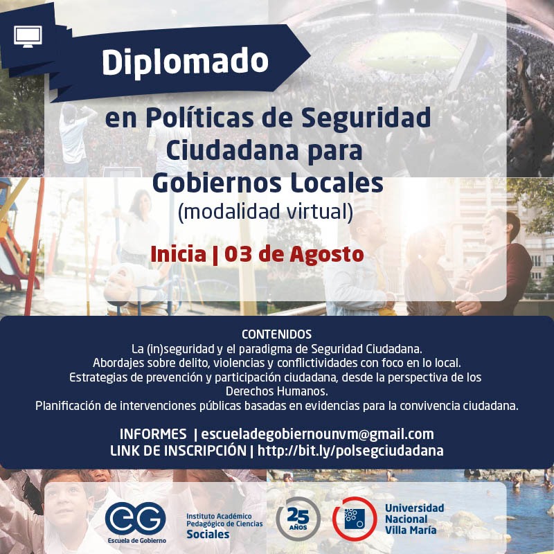 El día lunes 3 de agosto iniciará el Diplomado en Políticas de Seguridad Ciudadana para Gobiernos Locales, organizado desde Escuela de Gobierno del I.A.P. de Ciencias Sociales de la UNVM.