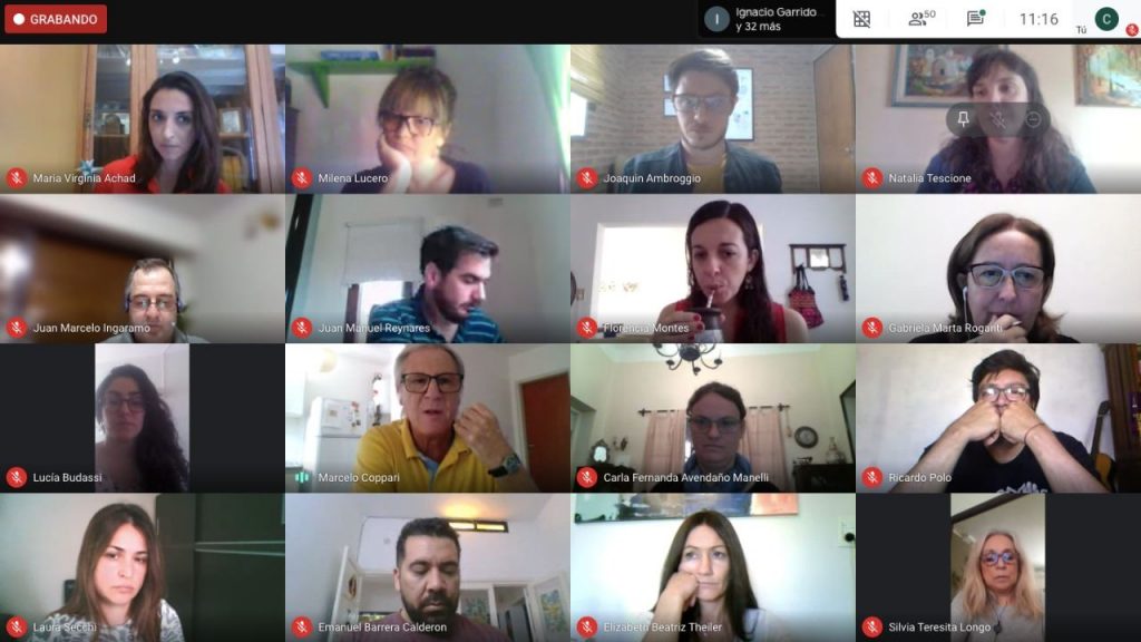 Posteriormente, los/as docentes  Melisa Reinoso (IPET 147), Gabriela Roganti (ISBR), Milena Lucero (UNVM) y Juan Manuel Reynares (UNVM),  relataron sus experiencias pedagógicas sobre la implementación de espacios curriculares en la modalidad virtual.